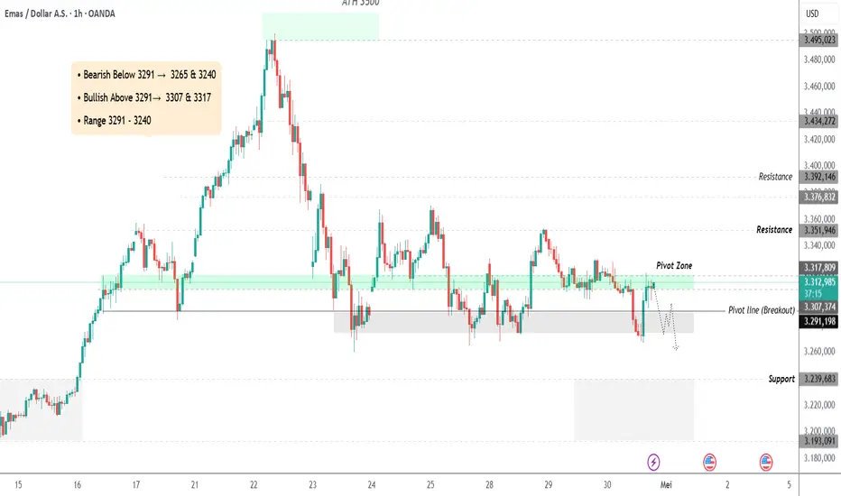 Namun, jika harga kembali menembus di atas 3291, hal itu dapat memicu pembalikan bullish, menargetkan 3307 dan 3317.