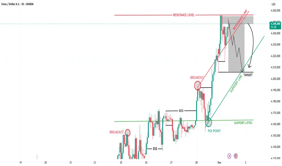 Harga mengalami penolakan kuat di area resistance 4.245 โ 4.255
