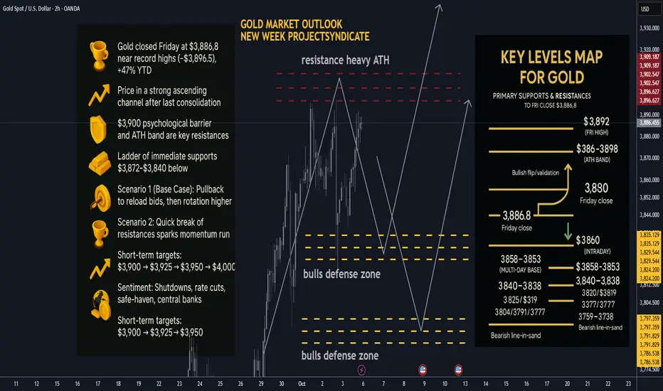 Gold (XAUUSD) closed Friday at $3,886.8, after printing a session high near $3,891.9. The latest all-time high is ~$3,896.5 (Thu), putting $3,900 squarely in play as the next psychological milestone. YTD performance remains extraordinary (≈+47% in 2025).