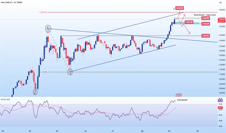 Kami menggunakan pendekatan AB=CD, potensi atas titik D ada di 3565 di confluence dengan paralel bull trendline. Level area ini berpotensi sebagai area retrace.