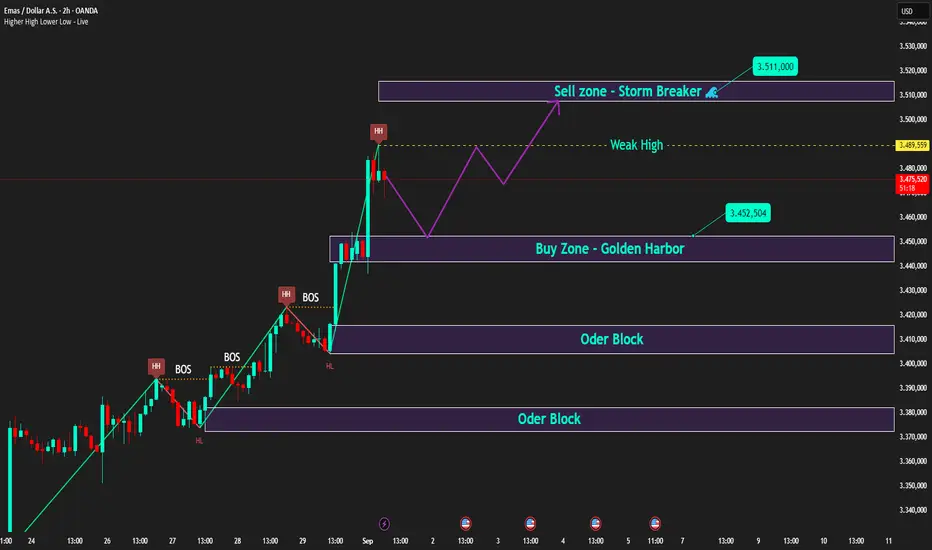 🌊 Storm Breaker (Sell Zone 3511 – 3518): resistance kuat, berpotensi muncul supply saat harga retest.