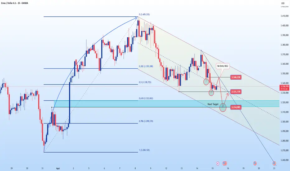 Target turun selanjutnya ke 3314 untuk re-test RBS dan Fibo 61.8% yang confluence.