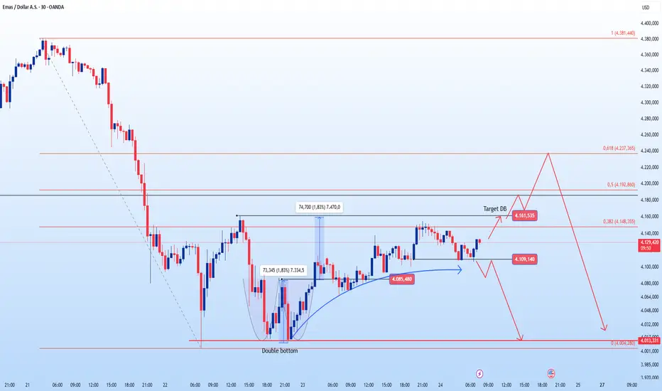 Harga emas saat ini masih dalam fase konsolidasi setelah penurunan tajam sebelumnya. Terlihat pola double bottom yang terbentuk di area 4.085, memberikan sinyal potensi reversal jangka pendek menuju area retracement Fibonacci.