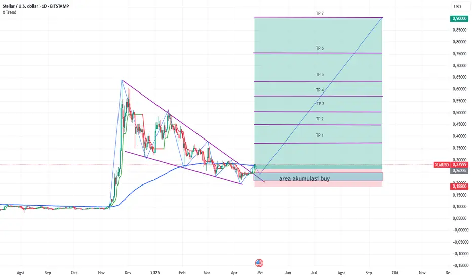 Pada TF Daily terlihat pergerakan harga XLMUSD yang berpotensi membentuk pola falling wedge. saat ini harga sudah break dari trendline dan bisa lakukan entry posisi buy. bisa lakukan average jika harga turun pada kotak yang sudah tandain. lakukan posisi buy secara bertahap dengan SL 0.188 dan TP MAX di area 0.900