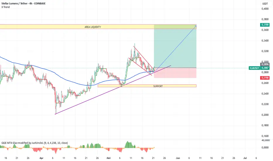 Pada TF H4 terlihat pergerakan harga dari koin XLMUSDT yang masih dalam tren bullish. hal ini di lihat setelah XLMUSDT berhasil membuat swing high baru. saat ini harga melakukan koreksi dan berpeluang membentuk pola falling wedge yang mengindikasikan harga berpeluang melanjutkan penguatan ke area resistance selama harga mampu bertahan di atas level support. bisa lakukan posisi buy dengan SL 0.2700 dan TP 0.3700