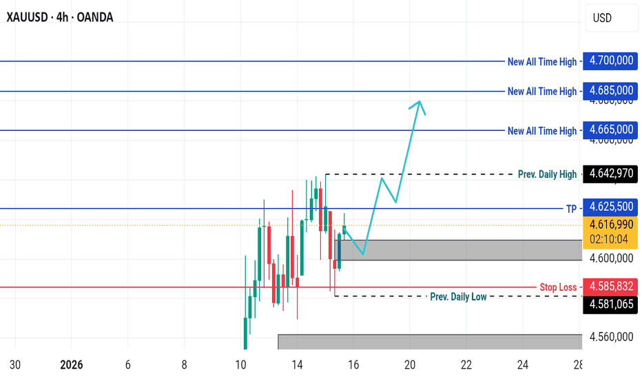 Selama harga mampu bertahan di atas zona demand, maka peluang lanjutan kenaikan menuju area 4700–4720 tetap terbuka.