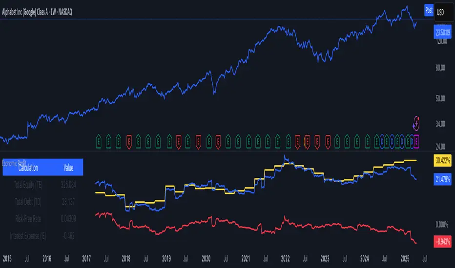 The Economic Profit Indicator is a Pine Script™ tool for assessing a company’s economic profit based on key financial metrics like Return on Invested Capital (ROIC) and Weighted Average Cost of Capital (WACC). This indicator is designed to give traders a more accurate understanding of risk-adjusted returns.