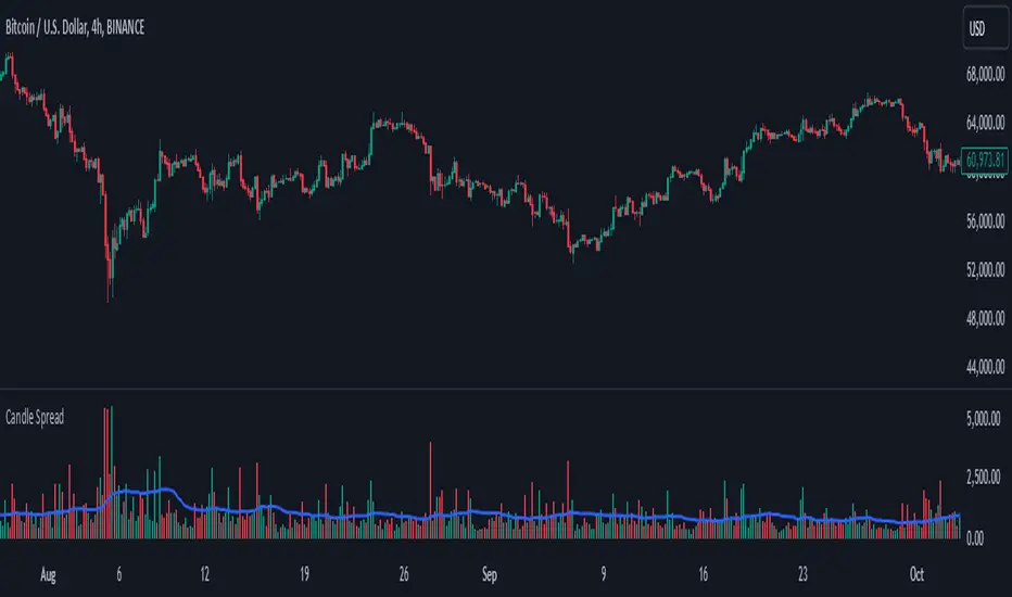 Candle Spread is an indicator that helps traders measure the range of price movement within each candle over a specified time period. It calculates the range of the candle between the High and Low (High - Low) and displays it in a separate window below the chart as columns.