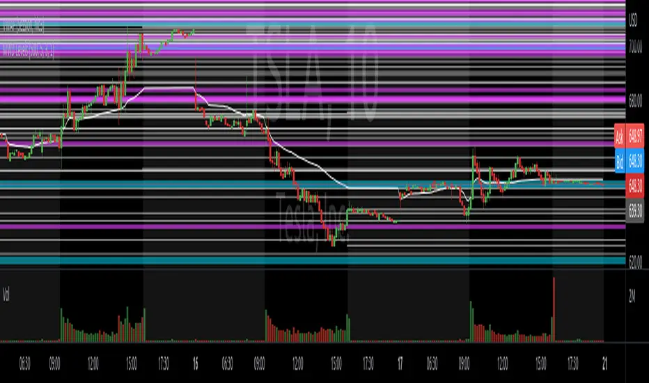 This script will show monthly, weekly and daily (with or without pre market) levels on your intraday chart. You can chose what values of the corresponding candles (high, low, close) should be included.