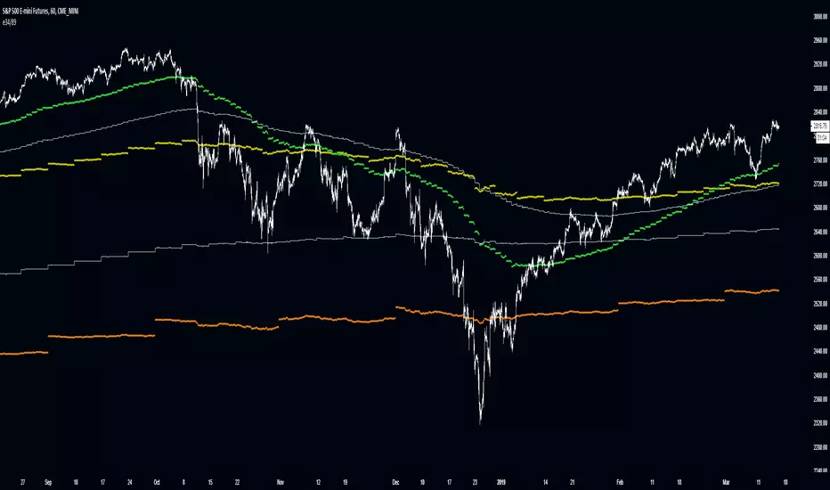 These multi-timeframe 34 and 89 period ema use an improved calculation to accurately calculate the indicator's value with every new bar on the time frame your chart is set to. Previously the indicator only recalculated with every new update on the timeframe used in its security function. This means that this improved script plots the real, current value of your indicator across your chosen timeframes on your chart's resolution and no longer only plots only the indicator's monthly/weekly/daily/4 hour/ect closing value on the your chart.