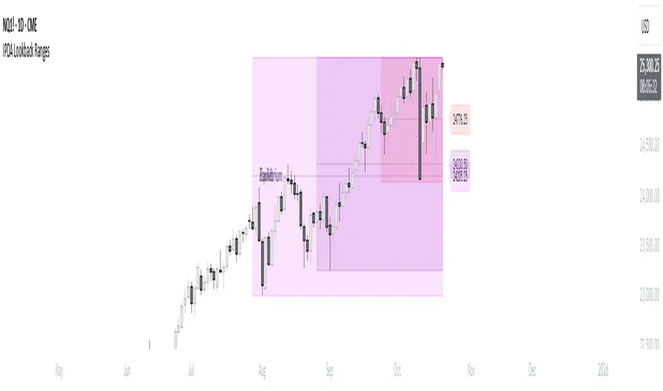 Visualize institutional market structure with the IPDA Lookback Ranges & Premium/Discount Zone indicator.