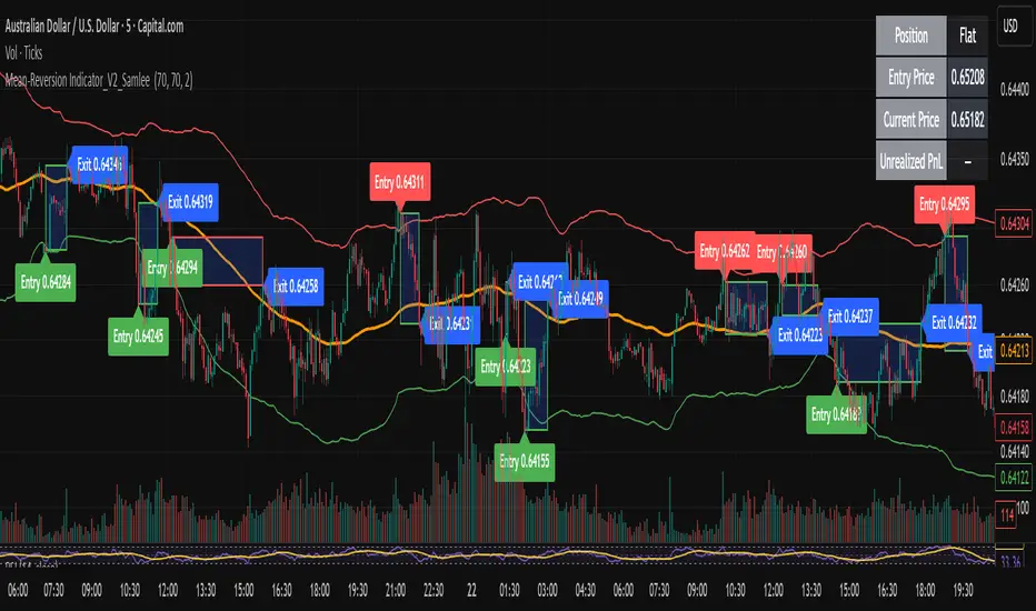 This is the second version of my mean reversion indicator. It combines a moving average with adaptive standard deviation bands to detect when the price deviates significantly from its mean. The script provides automatic entry/exit signals, real-time PnL tracking, and shaded trade zones to make mean reversion trading more intuitive.