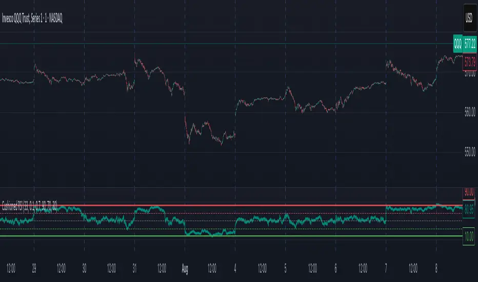 Instead of using raw price changes directly, it applies two distinct "damping" mechanisms to the underlying price gains and losses before they are fed into the final RSI calculation. This results in an RSI line that has built-in resistance to extreme movements.
