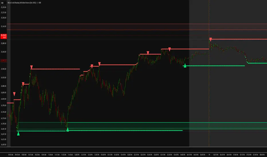 * **Zones**: shaded boxes from the *previous candle* that created the signal; auto-extend and optionally auto-delete.