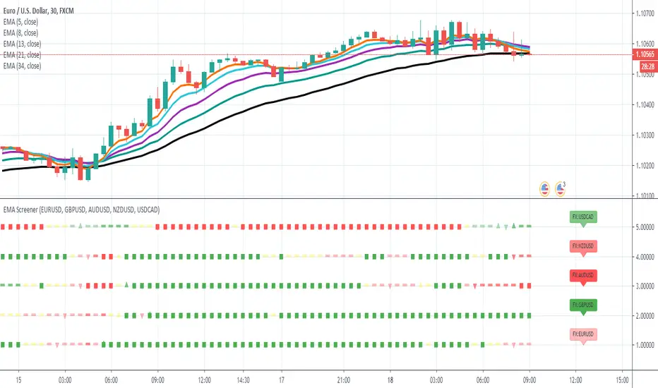 In that case, I'm comparing 5 EMAs relatively to each other and display: