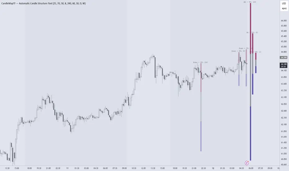 This Pine Script creates an "Automatic Candle Structure Tool" for TradingView that visually manages market structure and dealing ranges across multiple timeframes.
