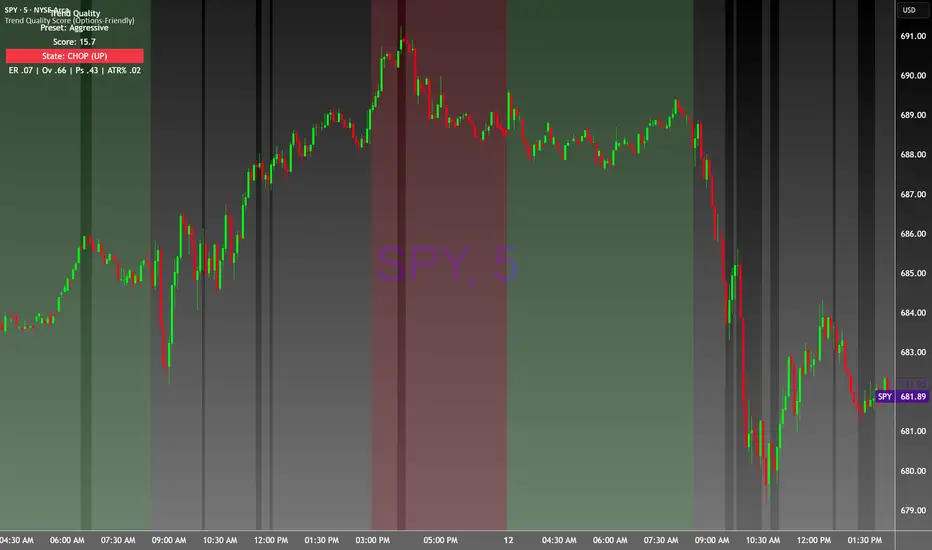 Trend Quality Score for options entry that signals with background coloring for good movement or chop, to avoid theta burn. Toggle for conservative, balanced or aggressive with triggers.