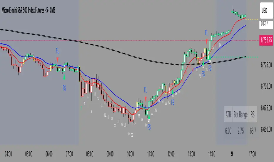 Includes RTH/ETH bar numbering with OB/OS awareness and a live stats panel showing ATR, bar range, and RSI.