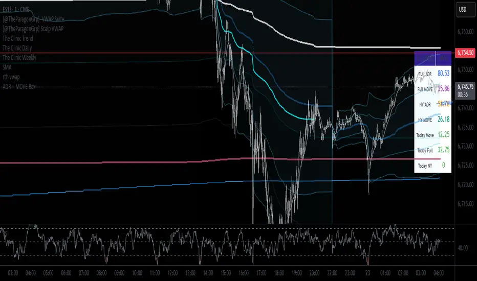 ADR + Move 20 day average Box for any ticker. Calculates the average daily range as well as the absolute delta from open to close. For Full day as well as NY session only