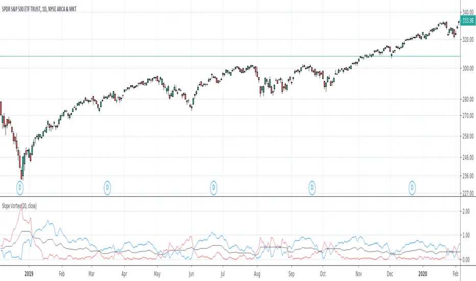 The indicator basically takes two slopes from the trailing time period you indicate- one from the highest point in that time period, and one from the lowest point. It then plots both.