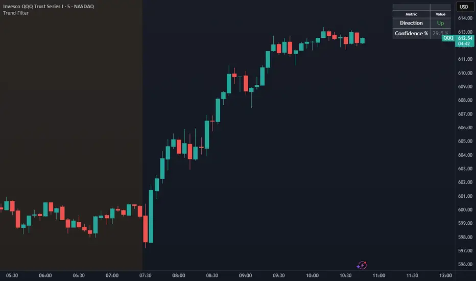 Trend Filter is a premium trend-classification indicator designed to identify whether a ticker is trending Up, trending Down, or Ranging, along with a real-time Trend Confidence %.