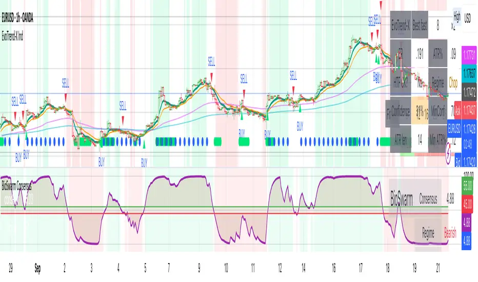 EvoTrend-X is adaptive trend indicator that learns which moving-average length best fits the current market. It maintains a small “population” of fast EMA candidates, rewards those that align with price momentum, and continuously selects the best performer. Signals are gated by a multi-factor Confidence score (fitness, strength vs. ATR, MTF agreement) and a volatility filter (ATR%). You get a clean Fast/Slow pair (for the currently best candidate), optional HTF filter, a fitness ribbon for transparency, and a themed info panel with a one-glance STATUS readout.