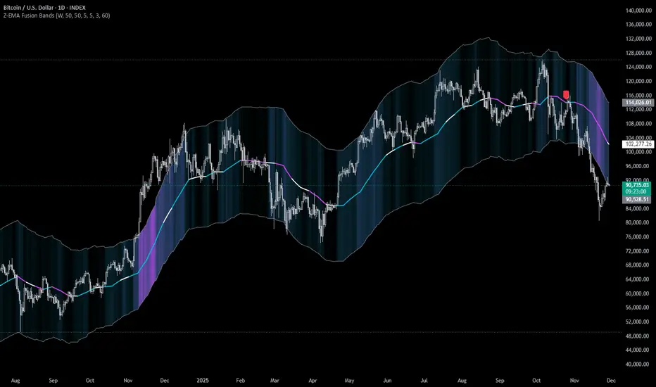 - The area between the bands is filled using a Z-score-based gradient, which dynamically adjusts color based on how far price is from the EMA (in terms of standard deviations).