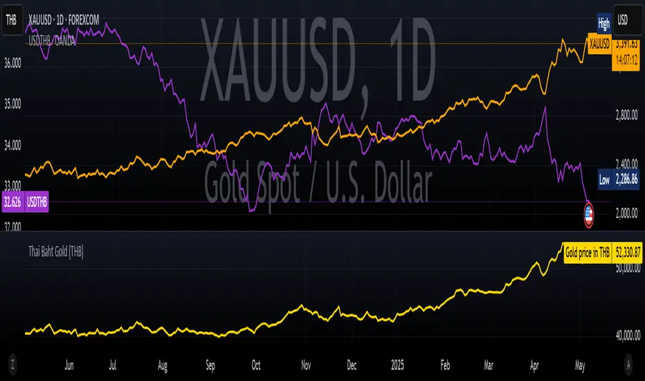 This indicator calculates and visualizes the real-time price of 1 Thai Gold Baht (15.244 grams) based on the global gold price (XAU/USD) and the USD/THB exchange rate.