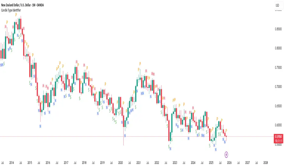 The Candle Type Identifier classifies every bar into four signature candle categories using structured body-to-range analysis and wick behaviour. This helps traders instantly recognize strength, rejection, and special closing conditions within price action.