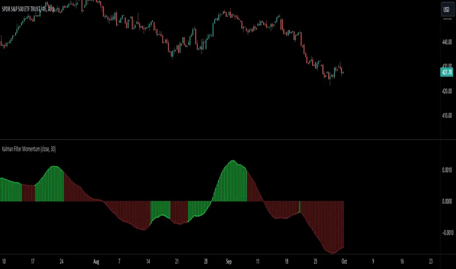 This indicator implements the Kalman Filter to provide a smoothed momentum indicator using returns. The momentum in this indicator is calculated by getting the logarithmic returns and then getting the expected value.