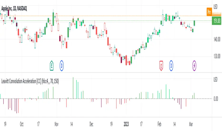 The Leavitt Convolution Slope indicator was created by Jay Leavitt (Stocks and Commodities Oct 2019, page 11), who is most well-known for creating the Volume-Weighted Average Price indicator. This indicator didn't have a good explanation or description so I custom-coded most of it. The way it works is it will give trend spikes in the direction of the underlying trend. If you don't see a spike then it means that the stock isn't trending at the moment. One possible avenue to explore with this indicator is judging the size of the trend spike before you open a position in that direction (or the opposite direction if you are shorting). I added a normalization function using code from a good friend loxx that I recommend leaving on but feel free to experiment with it. I have color coded the lines to turn light green for a standard buy signal or dark green for a strong buy signal and light red for a standard sell signal, and dark red for a strong sell signal.