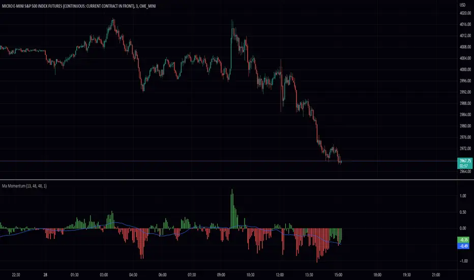 This simple script takes two ma's sums them and takes the the difference between the current and previous data points. This gives a lovely smoothed momentum indicator. The way it works is if its green its good and if its red its bad. In other words, I take the smooth signal as a filter for the momentum. You can also spot divergences between the indicator and the price to make decisions. Some features include extra smoothing and adjustable ma's. I hope you find this script useful!