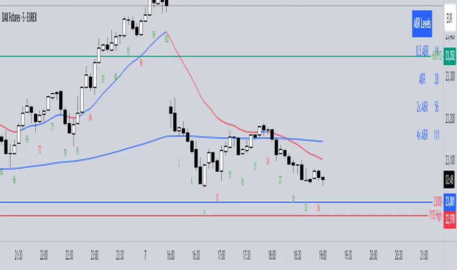 The **ABR Levels** indicator dynamically calculates the **average bar range** and plots three key levels on your chart: