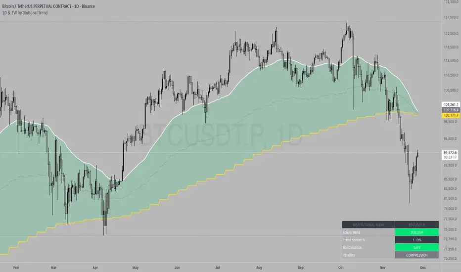 The 1D & 1W Institutional Trend is a multi-timeframe (MTF) trend-following system designed to align traders with major "macro" market moves. Instead of relying on noisy intraday data, this indicator pulls data from the Daily (1D) and Weekly (1W) timeframes to construct a robust trend baseline, regardless of the chart timeframe you are currently viewing.