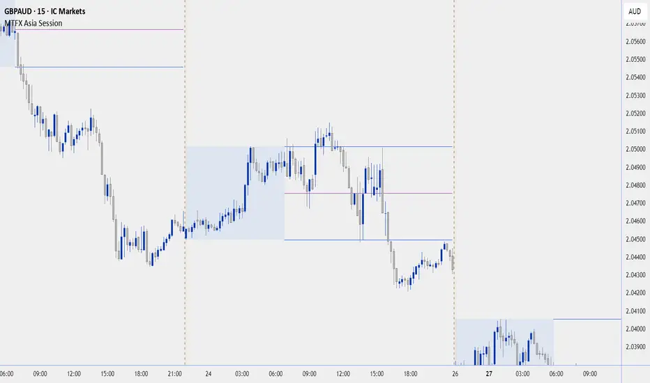 The session box appears once the Asia session ends, locking in the range. Extended lines help track how London/New York trades against Asia’s containment. Alerts are included for price touching Asia high/low.