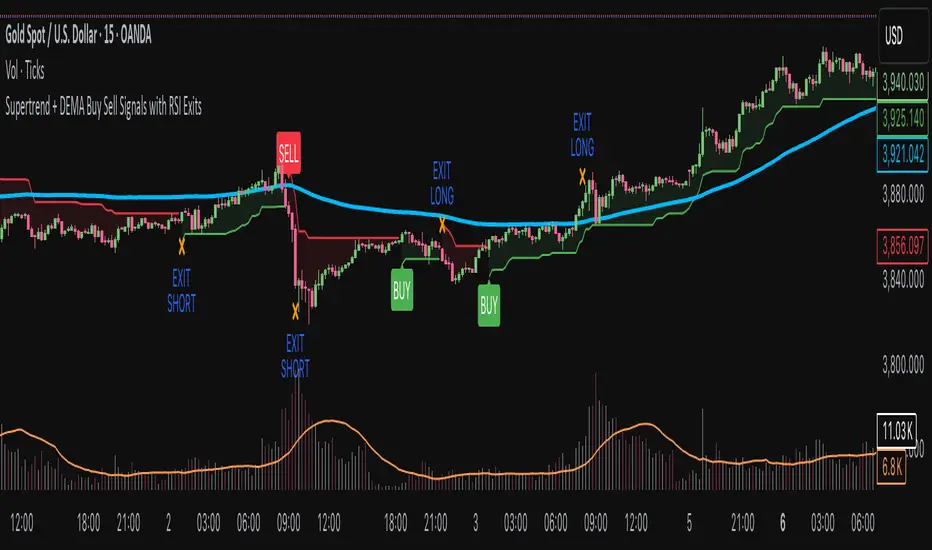 A complete trend-following indicator that combines Supertrend and Double EMA (DEMA) for precise buy/sell entries, with optional RSI-based and Supertrend-based exit signals.