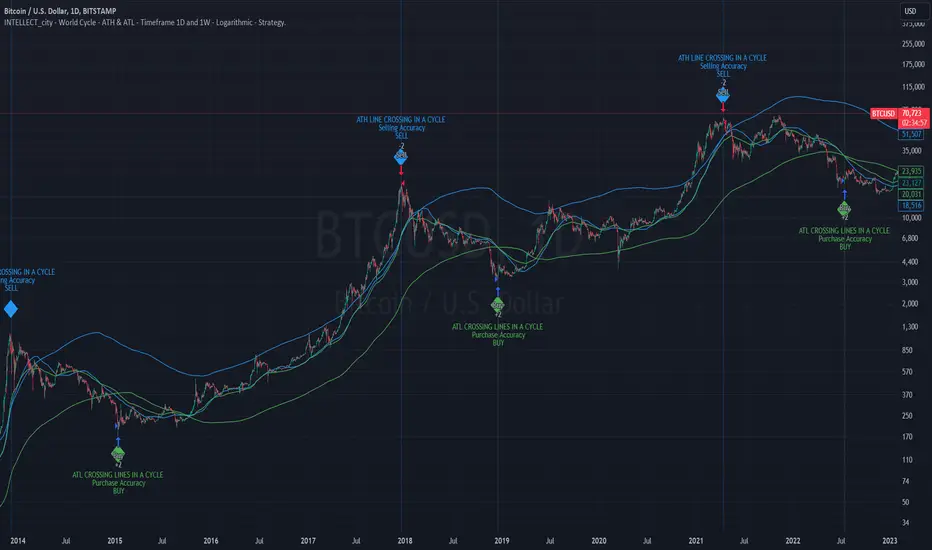 INTELLECT_city - World Cycle - ATH & ATL - Timeframe 1D and 1W - Logarithmic - Strategy - Логарифмический - Сигнал - Осциллятор вершины и основания цикла Пи представляет собой адаптацию оригинального графика вершины цикла Пи. Он сравнивает круг 111-дневной скользящей средней и круг 2 * 350-дневной скользящей средней цены Биткойна. Эти две скользящие средние были выбраны как 350/111 = 3,153; Приближение важного математического числа Пи.