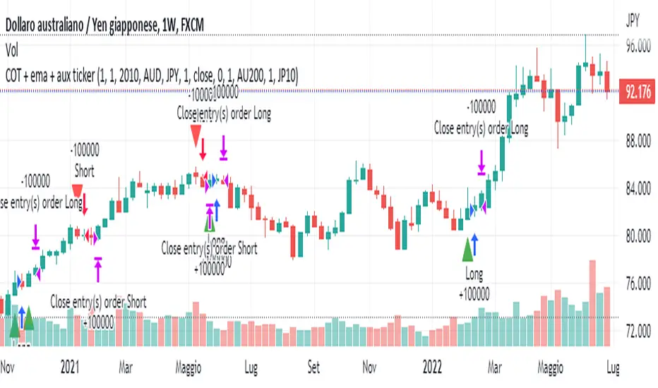 How does it works: the script use Commercials Delta Conctract, EMA of the selected ticker, EMA of 2 auxiliary tickers (e.g. correlated ticker) to generates buy and sell signals, it allows to include or not each of these.