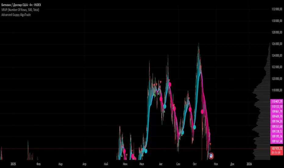 **Advanced Guppy AlgoTrade** is an enhanced version of the classic Guppy Multiple Moving Average (GMMA) indicator, specifically optimized for algorithmic trading and early trend detection. This indicator uses 9 moving averages to identify trend direction and provides precise entry/exit signals with smooth gradient color transitions.