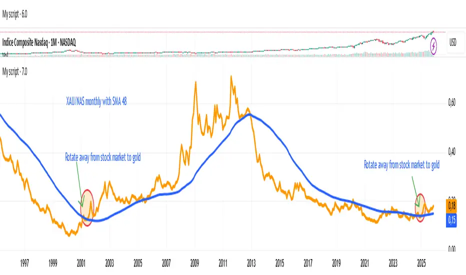 XAU/NASDAQ monthly with SMA 48