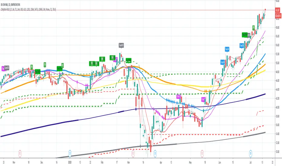 The used Moving Averages can be chosen between EMA and MyMA. MyMA is a Moving Average that tries to mimic Bo William's MIMA. Due to the close resemblance between MyMA and MIMA, I do not feel comfortable to open this script source code. In order to learn how this script operates with EMAs, please refer to my Custom EMA + Fibo indicator that has its source code open.