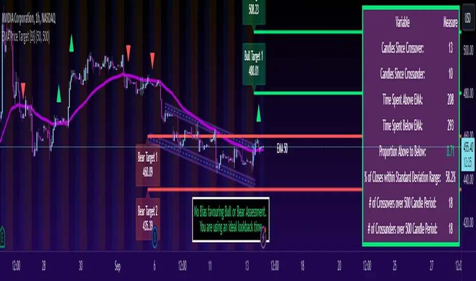 This will provide you with a breakdown of the statistics on the EMA over the designated lookback period, such as the number of crosses, the time above and below the EMA and the amount the EMA has remained within its standard deviation bands.