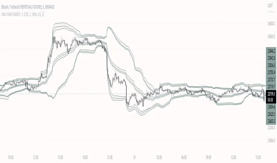 Rather than using the usual calculation for the VWAP, instead this script smooths the volume first with the SMA and then respectively calculates the smoothed multiplication of high, low and close price with the volume individually. These values are then divided by the smoothed volume to find individual VWAP's for each of the sources. The standard deviations of these are calculated, resulting in an upper, lower and middle band. It is essentially VWAP bands with some smoothed calculations in the middle.