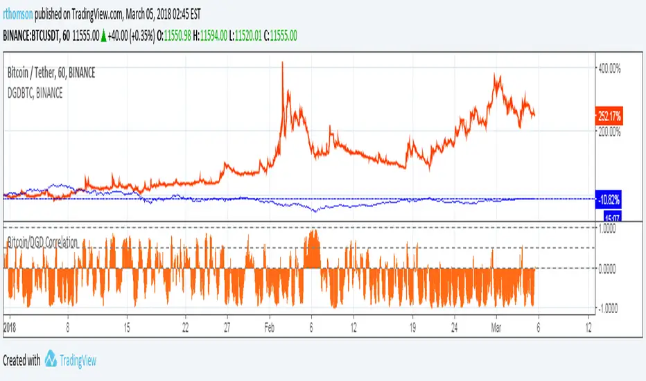 Does exactly what it says, shows the correlation between DGDBTC on Binance, with the ticker. Notably has been fairly consistently inverse for quite some time now.