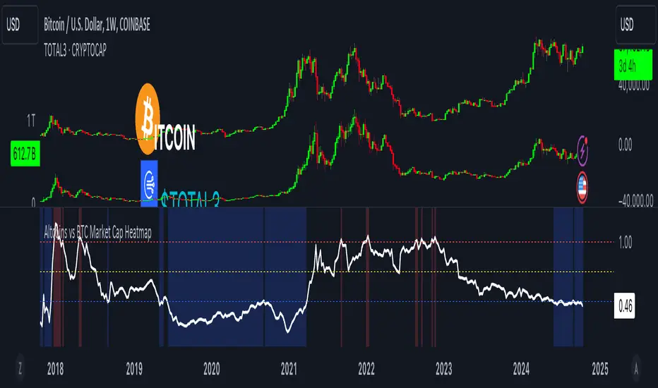 This indicator provides a visual heatmap for tracking the relationship between the market cap of altcoins (TOTAL3) and Bitcoin (BTC). The primary goal is to identify potential market cycle tops and bottoms by analyzing how the TOTAL3 market cap (all cryptocurrencies excluding Bitcoin and Ethereum) compares to Bitcoin’s market cap.
