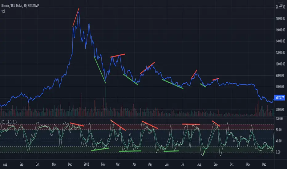 After I wrote this indicator I saw that it is a good indicator for reading divergences. As you can see I showed couple of these divergences to you on the chart. Notice that I analyzed divergence between price and J (very light green) line and not to K or D. I really appreciate any suggestion on this indicator and hope to improve it. The other ones present in the public library wasn't good and they differ a lot in the calculation and also the graphics doesn't look good.