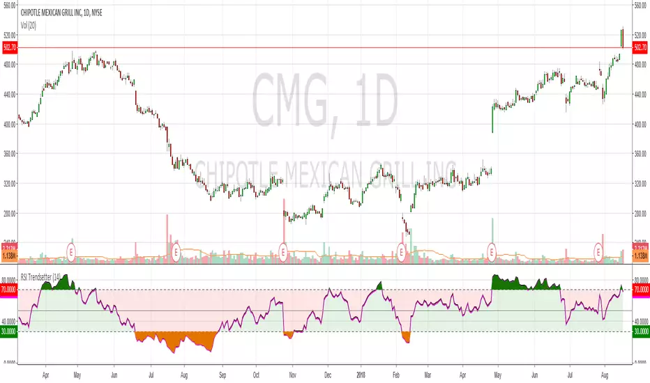 In the example CMG hasn't been overbought for 183 days, so the RSI is mostly green: