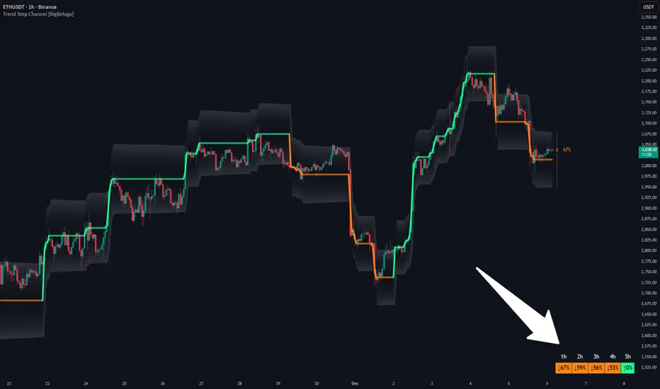 Trend Step Channel [BigBeluga] identifies directional bias by forming a dynamic volatility-based step channel. It detects trend shifts when candle lows close above the upper band (bullish) or when candle highs drop below the lower band (bearish). A step-style midline tracks the trend evolution, while an integrated dashboard shows price positioning percentages across multiple timeframes.