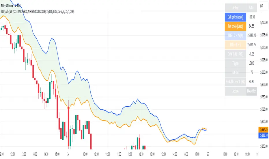 The PCP Arbitrage Monitor helps traders visualize and quantify deviations from the Put–Call Parity (PCP) relationship: