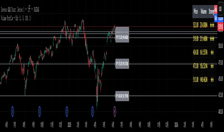 Volume Profile – Edz is a lightweight indicator that identifies the top high-volume price levels over a recent range of candles, using customizable price binning (priceStep) and lookback length. It highlights the top N volume clusters with horizontal lines, labels, and strength-based star ratings (★–★★★), and displays a compact summary table showing price, volume, and relative strength. Optimized for intraday and short-term trading, this tool updates only on the latest bar for maximum performance and is ideal for spotting volume-based support, resistance, and high-confluence trading zones.